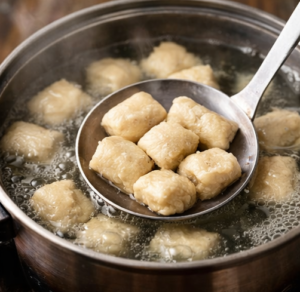 Divide dough into 4 pieces. Roll each into a rope about 1 inch thick, then cut into 1-inch pieces. - Boil